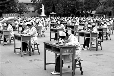 千余名考生坐在室外的操场上考试,每名考生间隔2米,考桌反方向摆放,考场中任何和考试无关的东西都不允许带入,笔由学校统一发放,考试现场无监考教师,学院监控室中留一名监考教师,如果发现违纪学生,将取消考生考试和分配工作资格。